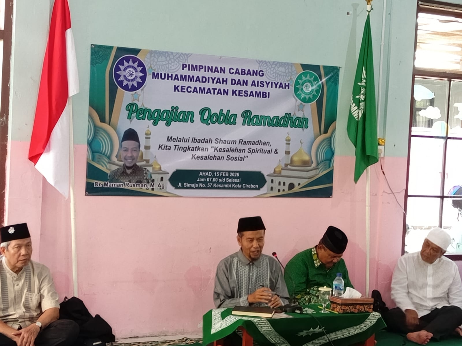 CIREBON, 15 Februari 2026 – Menyambut bulan suci Ramadhan 1447 H, Pimpinan Cabang Muhammadiyah (PCM) Kesambi menggelar pengajian Ahad pagi yang berlangsung khidmat, 15 Februari 2026. Acara yang bertempat di balai pengajian PCM Kesambi ini menghadirkan penceramah Ustadz Dr. Maman Rusman, M.Pd., mengambil tema “Dengan Saum Ramadhan Kita Tingkatkan Kesalehan Spiritual dan Sosial”.